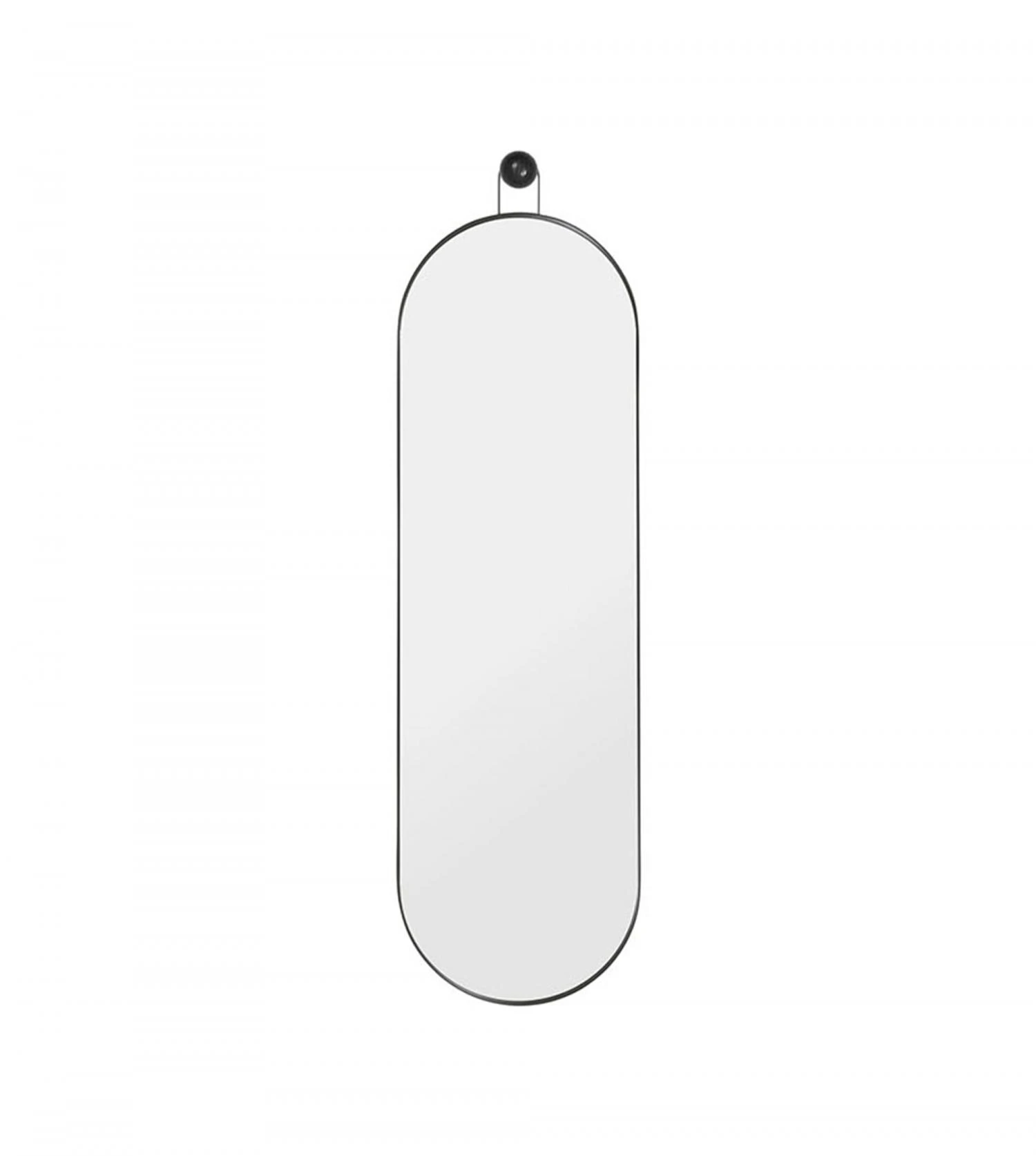 Un miroir aux lignes élégantes soutenu par une patÚre en bois. Le cadre oval du miroir est en métal laqué.