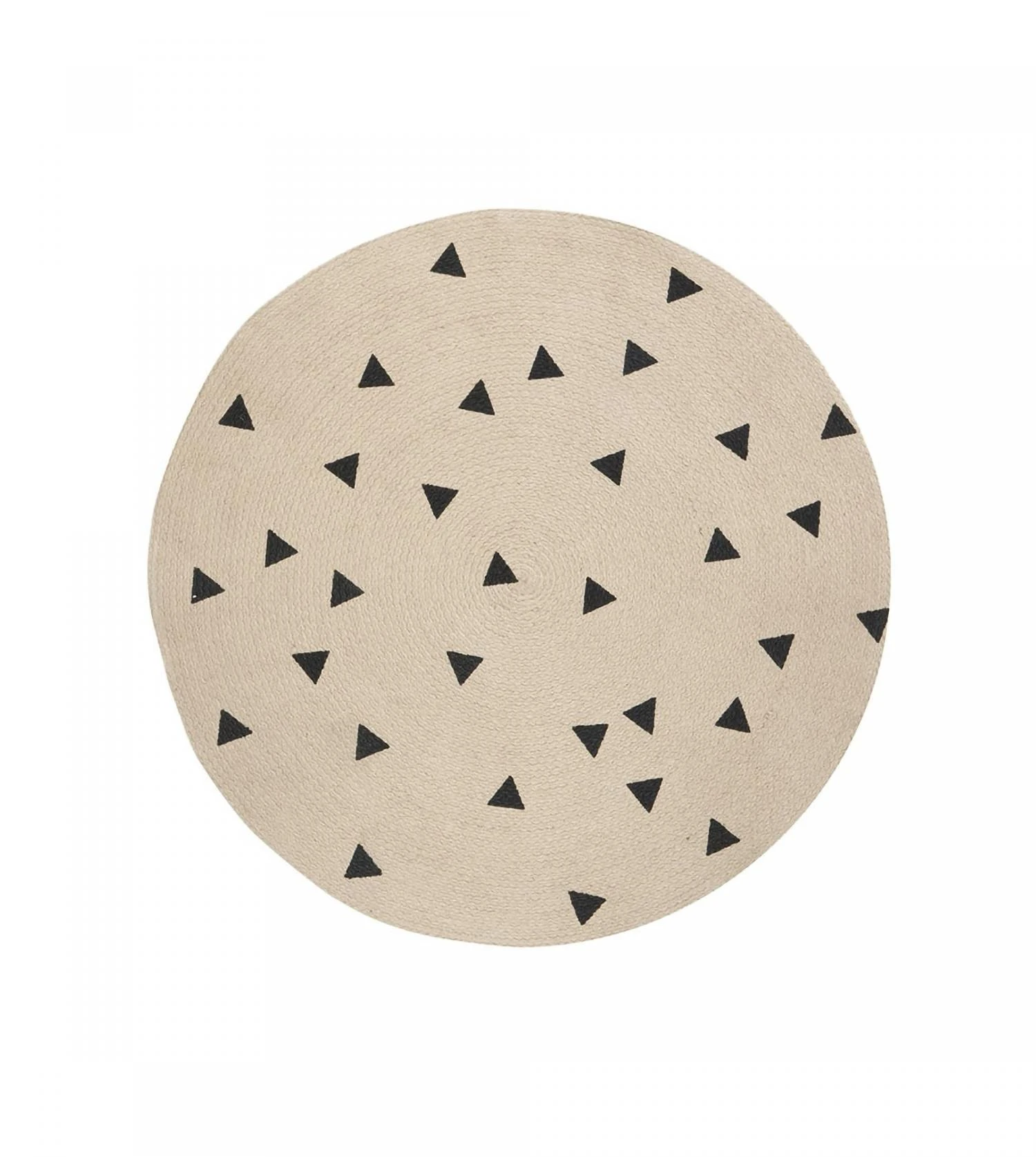Un petit tapis rond en jute avec un imprimĂ© graphique (pois, triangles ou batons)Â