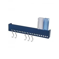 Une patère minimaliste composé d’une bande de bois perforée afin de venir y suspendre les crochets fournis.