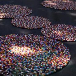 Pinocchio est un tapis qui fait sourire : rond, il est composĂ© de billes en laines toutes colorĂ©es. Ce tapis, inspirĂ© des petits bonbons danois, est fait au NĂ©pal oĂč chaque bille y est feutrĂ©e et enfilĂ©e sur un fil Ă la main.