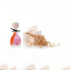 Poupées livrées dans un coffret cadeau en bois avec logo imprimé et brochure
